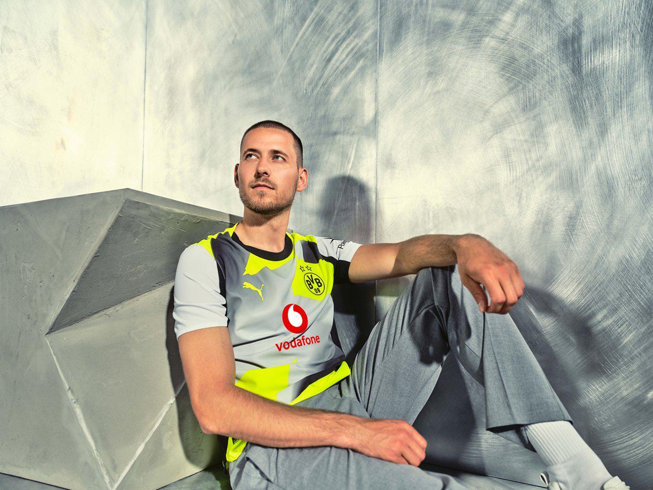 这款新球衣的供应商为彪马,服装的颜色采用了多特蒙德经典的黑色和黄色搭配,与主场球衣不同的是,球衣采用亮色进行搭配,底色为白色,上边点缀了黑色渐变色以及不同图案的亮黄色。