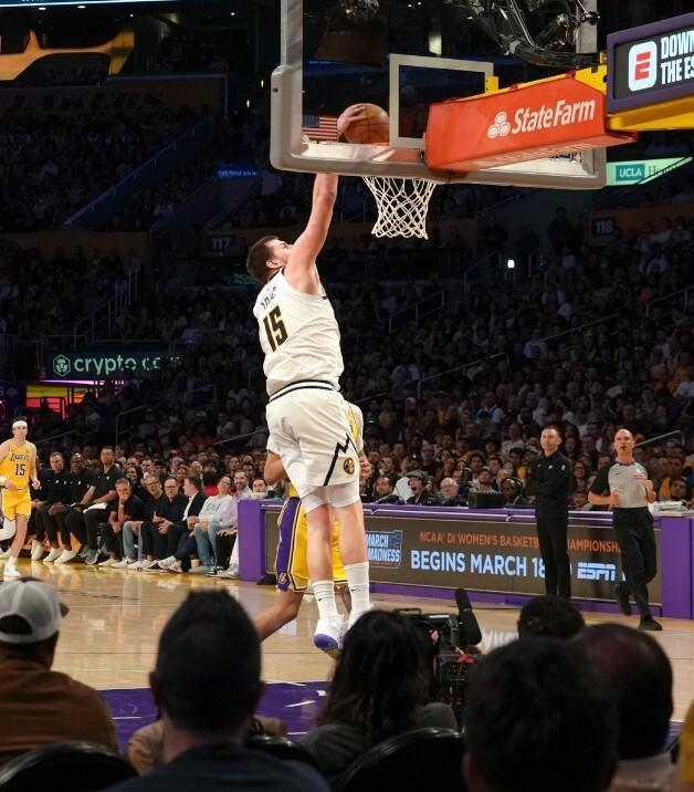 第三节中段掘金队开始追分,在约基奇的带领之下,一波9-0的攻势帮助掘金追到76-79。里夫斯和东契奇连得4分,帮助湖人稳住阵脚。最后1分钟布朗一人连拿5分,掘金在三节结束时追到87-87。