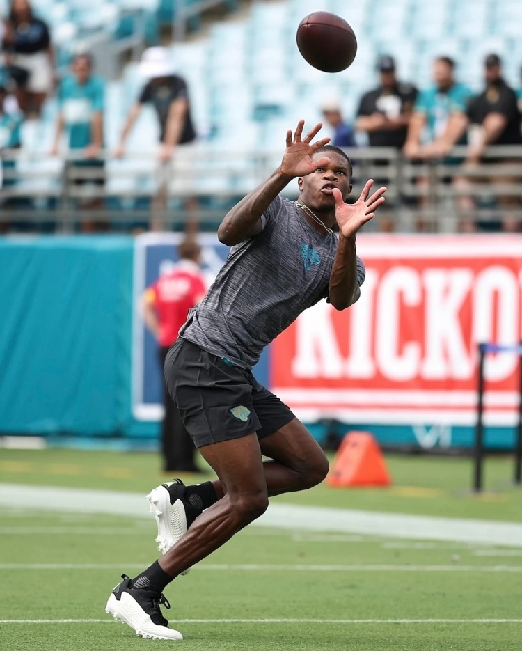 9月8日讯 NFL新赛季已经拉开帷幕,在今天杰克逊维尔美洲虎对阵卡罗莱纳黑豹的比赛中,美洲虎的榜眼特拉维斯-亨特上脚了一双特别版本的球鞋。这双鞋是官方为其打造的适用于NFL球场的钉鞋版本,球鞋的原版为爱德华兹的初代签名鞋AE 1。